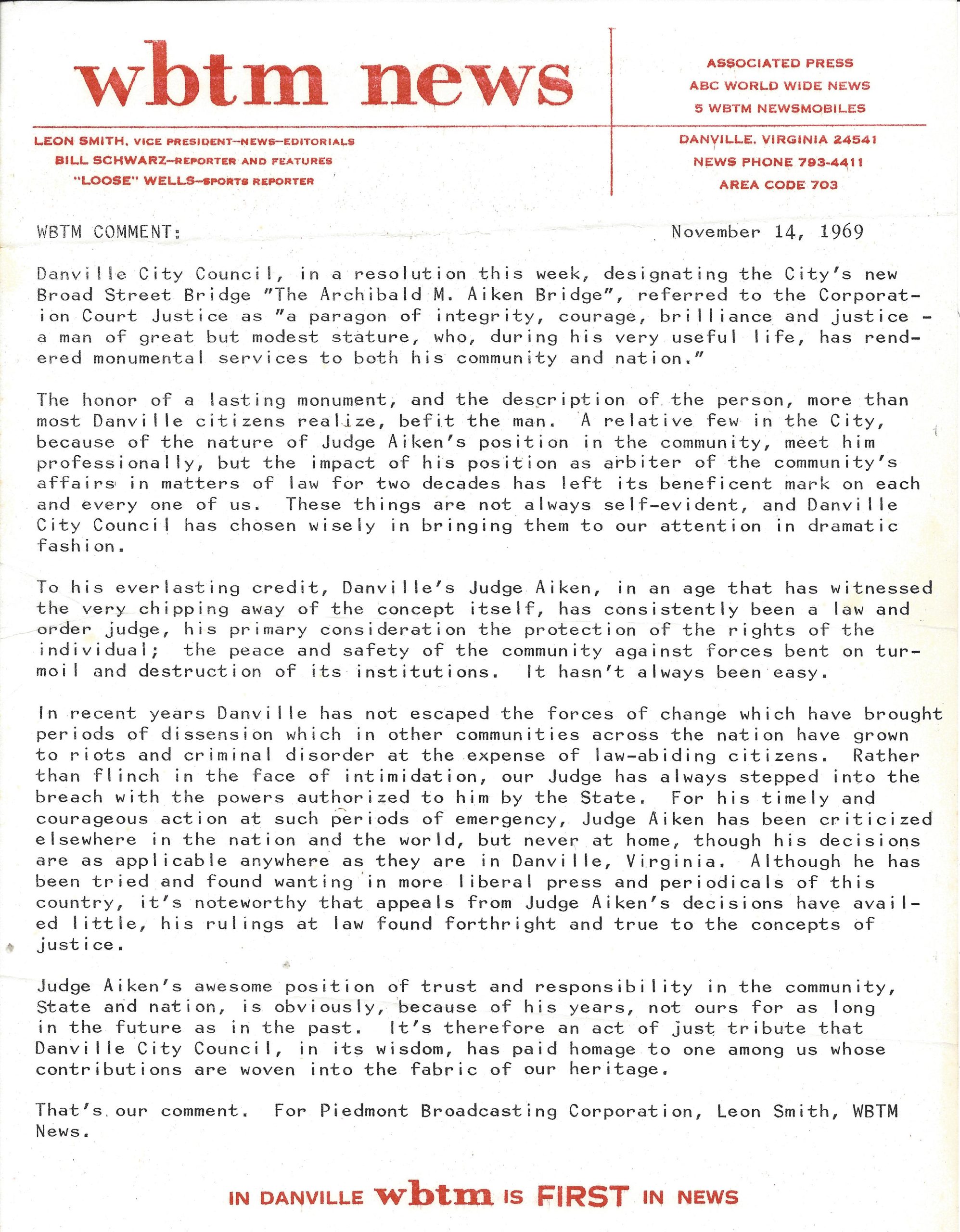 This report, also housed at the Danville Historical Society, goes on to say that the city council “has chosen wisely” to name the bridge after Aiken and commends him for his “timely and courageous action” against “forces bent on turmoil and destruction.”